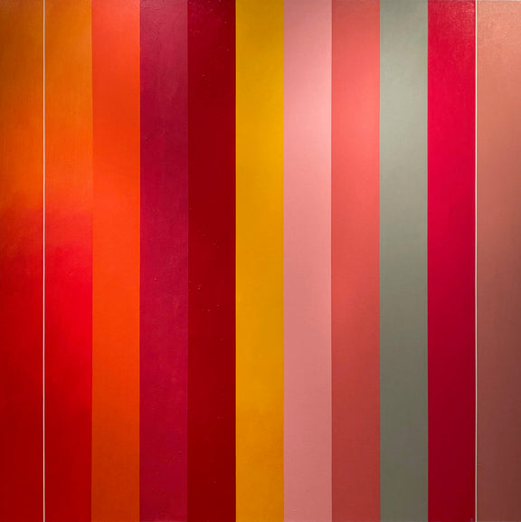 11 STRIPES is a meditation on the intersection of color, form, and meaning. fiery oranges and reds yielding to soft pinks, stone greys, and sand. The sequence moves from heat to hush, evoking skin, firelight, and shoreline. In its minimalist rhythm, the work contemplates beauty's brevity and life's resilience, inviting reflection on the tender balance between the ephemeral and the eternal.