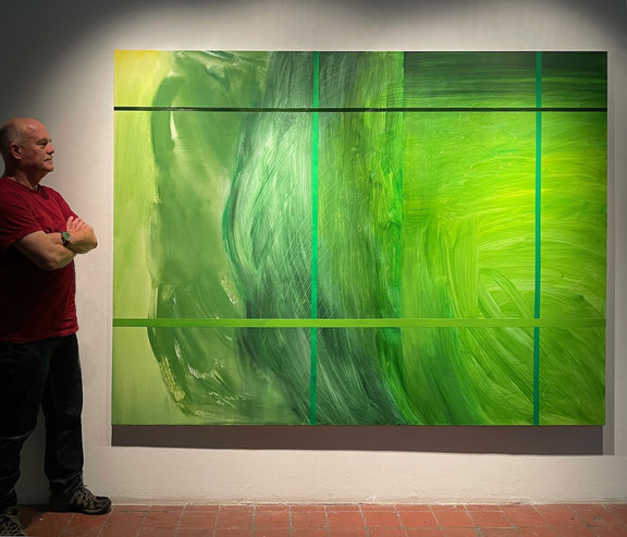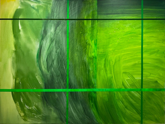 Green Symphony is a chorus of flowing green tones, where sweeping brushstrokes meet an irregular grid of vertical and horizontal lines. The composition captures nature's vitality its growth, fecundity, and complexity while revealing humanity's impulse to constrain and order it. Energetic gestures contrast with the enclosing grid, evoking a lyrical balance between freedom and structure.